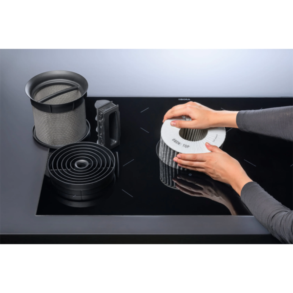 Puristlik pliidiplaadi õhupuhasti süsteem maksimaalse toiduvalmistamisruumi ja BORA Assistiga