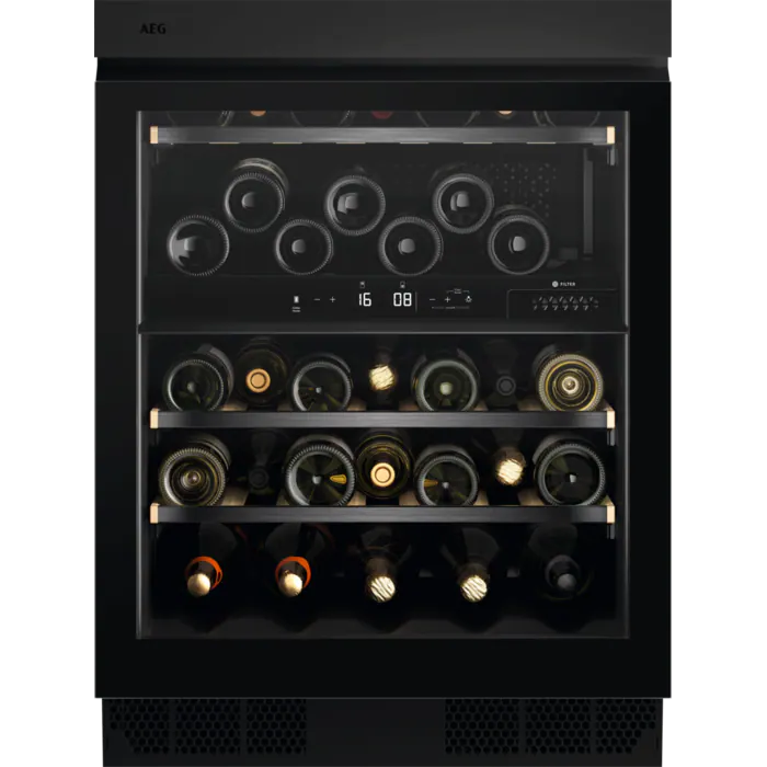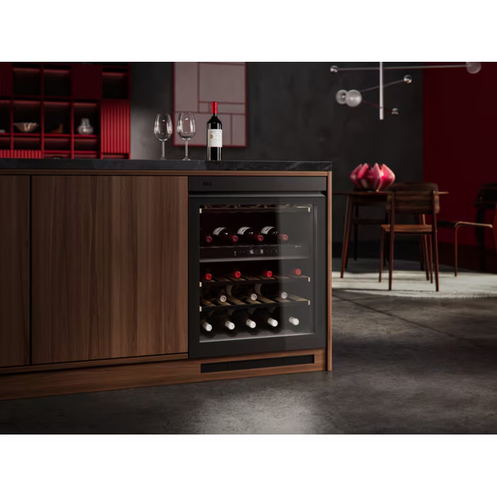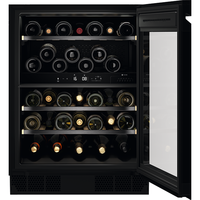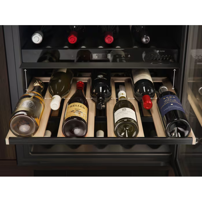 AEG NSW8D826GT integreeritav veinikülmik – riiulisüsteem 8000 Perfect võimaldab teil demonstreerida oma veinikollektsiooni kvaliteetsetel väljatõmmatavatel puitriiulitel. Riiulitele saate asetada sobiva vahega kõiki levinud 750 ml pudeleid ilma ettikette kriimustamata.