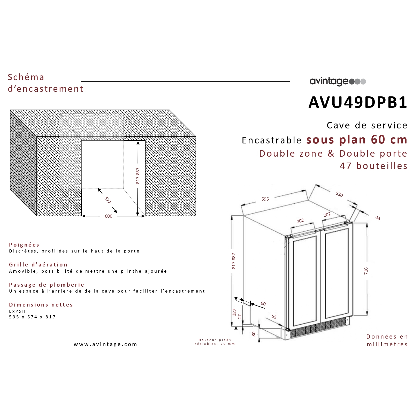 Avintage AVU49DPB1 integreeritav veinikülmik on Prantsuse FRIO grupi kaubamärk, mis on spetsialiseerunud sisseehitatud veinikülmikutele. AVINTAGE, mida tunnustatakse oma asjatundlikkuse, uuendusliku vaimu ja laia tootevaliku poolest, toetab nii amatööre kui ka professionaale oma parimate pudelite säilitamisel ja täiustamisel.