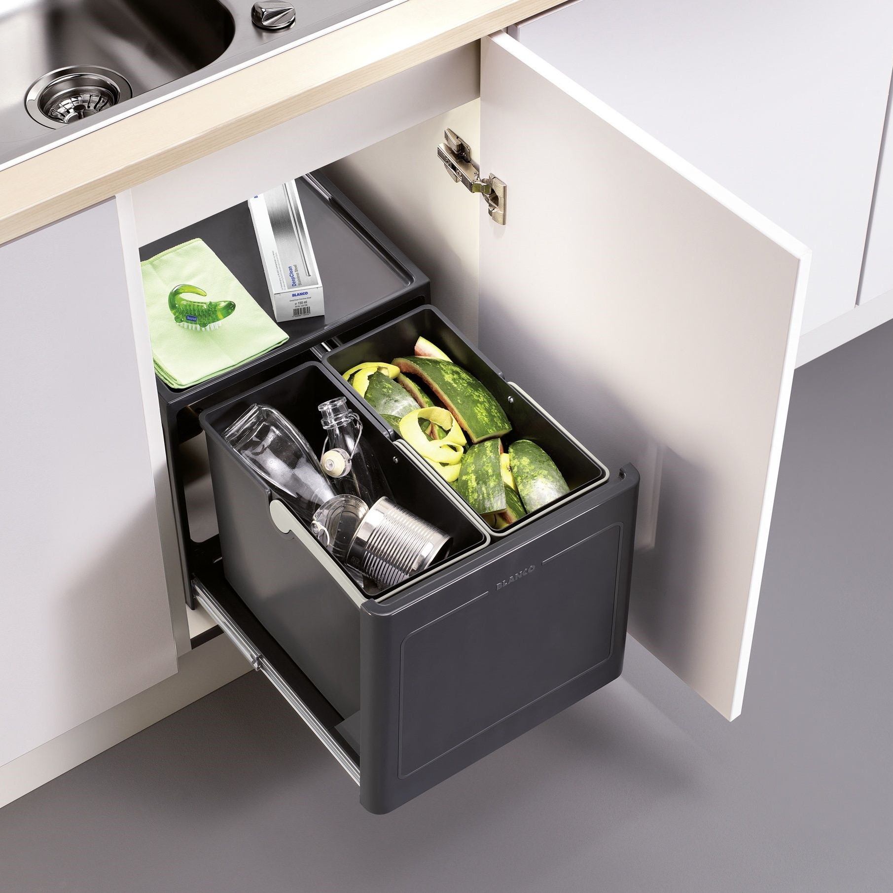 BLANCO sorter BOTTON Pro 45/2 Automatic – korvisüsteem konteinerite automaatse väljutamisega ukse avamisel. Lihtne kokkupanek – lihtsalt kinnitage kapi põhja ja paigaldage avamishoob uksele.