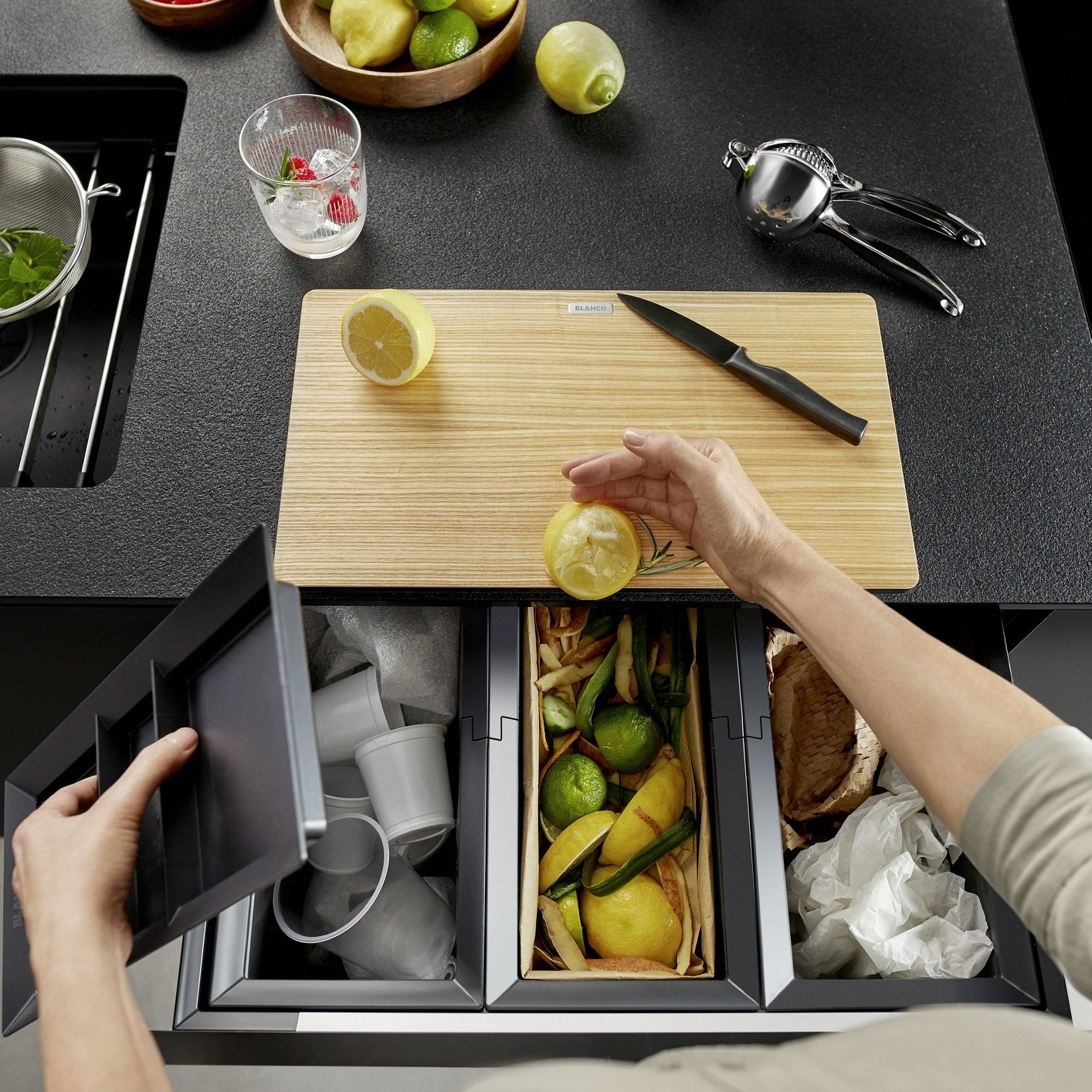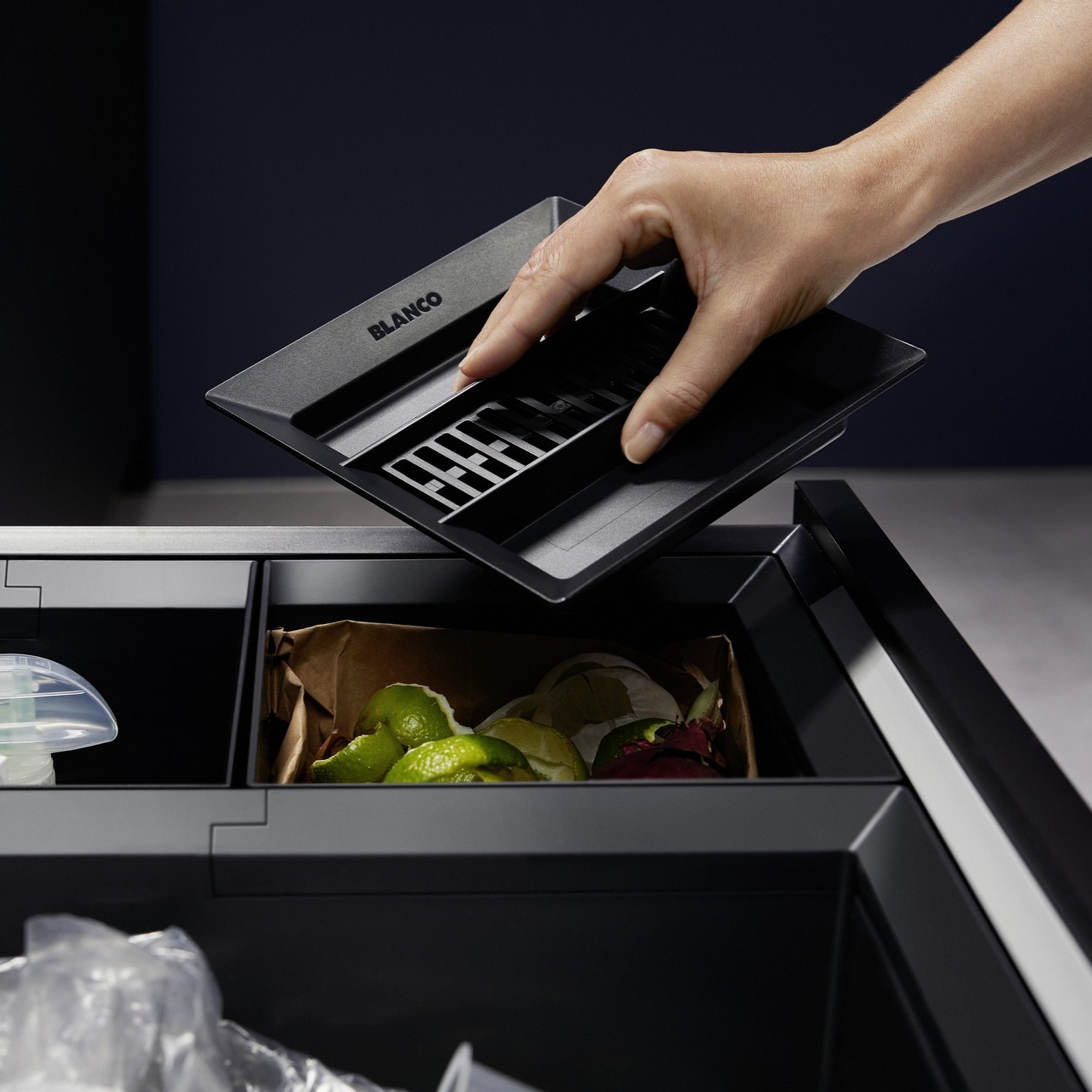 BLANCO sorter FLEXON II LOW 60/3 – kui valamu aluskapp on juba hõivatud veesüsteemi komponentidega, nagu filter või jäätmepurustaja ja pakub seetõttu vähe ruumi jäätmete eraldamiseks ja aluskapi korraldamiseks, paigaldatakse FLEXON II Low teise jagatud sahtlitega aluskappi kas alumisse sahtlisse või väga ergonoomiliselt tööpinna alla.