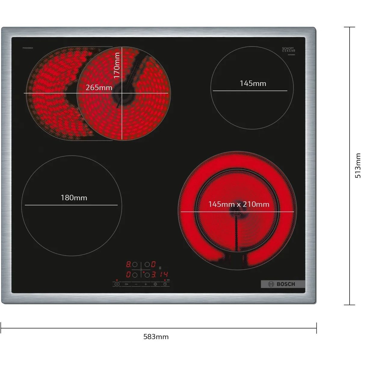 Bosch PKN645BB2E keraamiline pliidiplaat on täiendavate keedualadega suuremate nõude, näiteks röstimispanni jaoks.