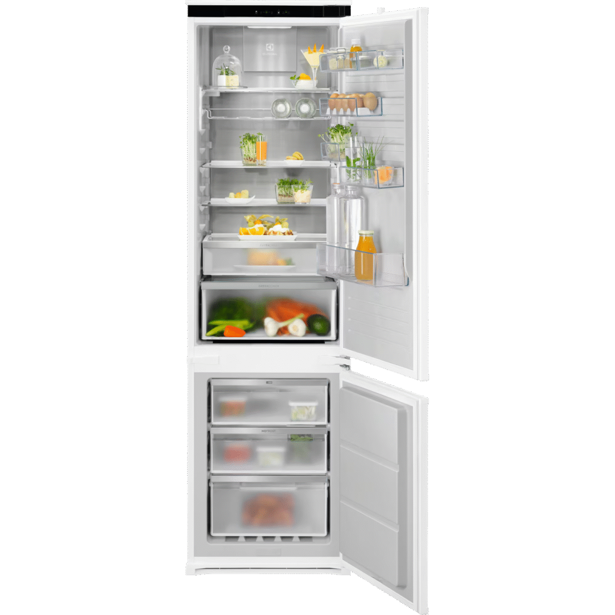 Electrolux E6MNCE19S integreeritav külmik-sügavkülmik 600 TwinTech® No Frost külmik-sügavkülmik kaitseb kõikide koostisosade maitseid. Selle topeltjahutussüsteem tagab, et sügavkülmik püsib härmatise vaba ja külmiku niiskus on optimaalne, vältides toidu kuivamist.