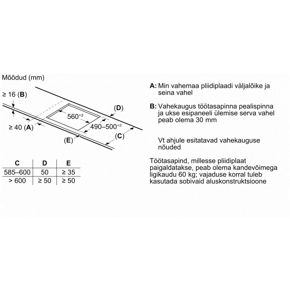 - Küpsetusala ees vasakul: 190 mm, 210 mm, 2,5 kW (maksimaalne võimsus 3,7 kW)