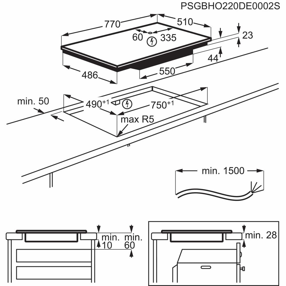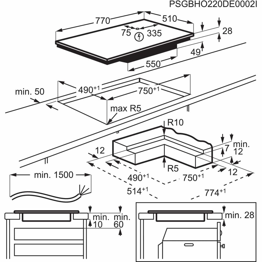 - Tööpinnapealne paigaldus/süvistatav tööpinda / lõigatud serv 90°