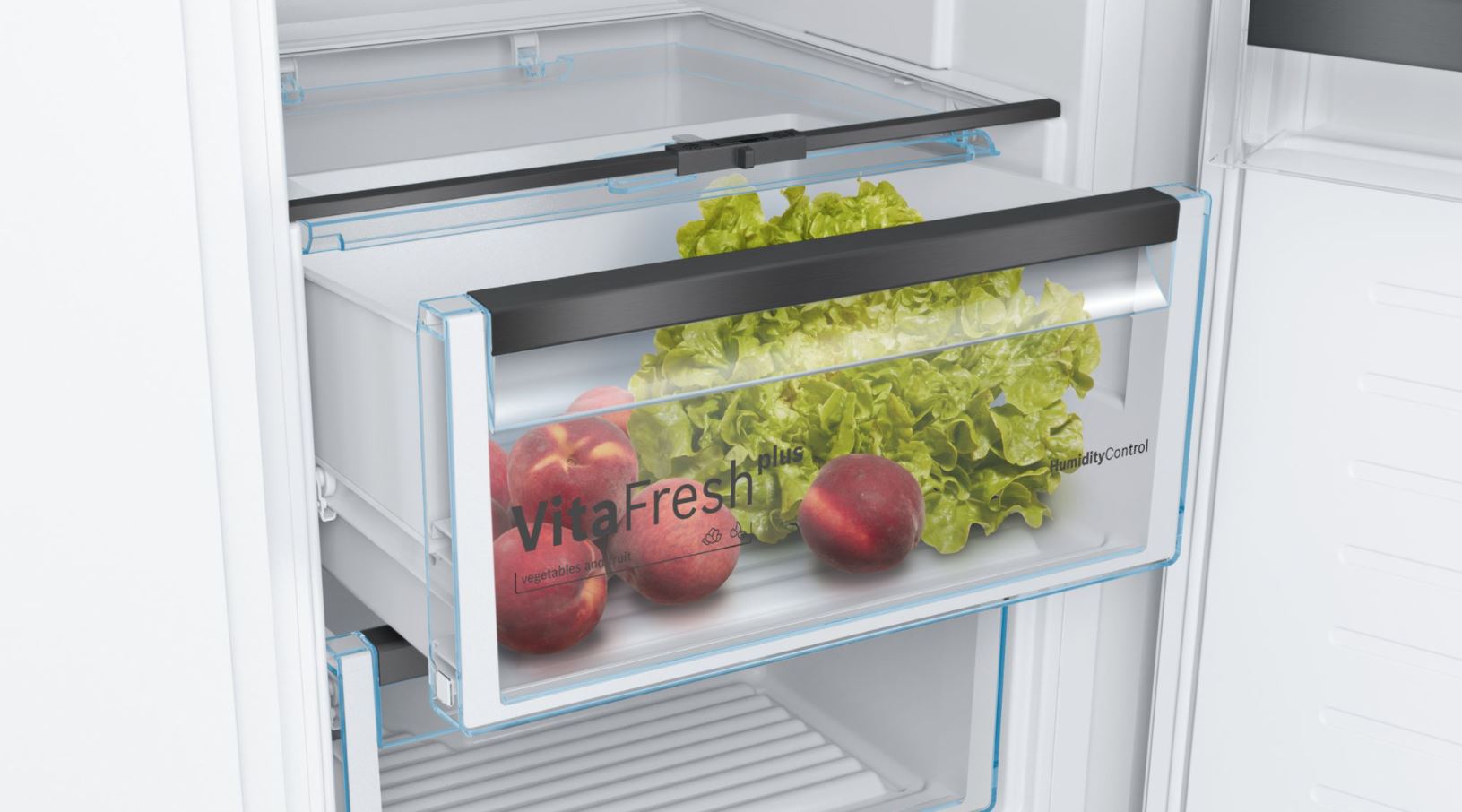 - Üks teleskooprööbastel ja niiskusregulaatoriga sahtel VitaFresh plus – puu- ja köögiviljade värskus ja vitamiinid säilivad kuni kaks korda kauem.