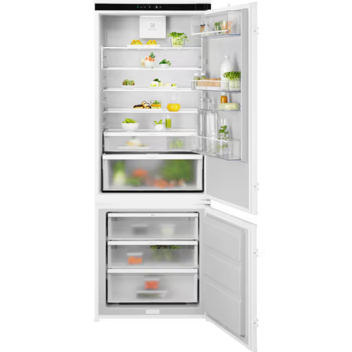 Integreeritav külmik-sügavkülmik Electrolux E7TNGE75S 600 TwinTech® No Frost külmik-sügavkülmik hoiab toidu 60% mahlasemana kui ühe aurustiga külmikud. Selle kahekordne jahutussüsteem säilitab ideaalse niiskuse ja hoiab ära toidu kuivamise. Ka ei pea te enam kunagi muretsema külmiku sulatamise pärast.