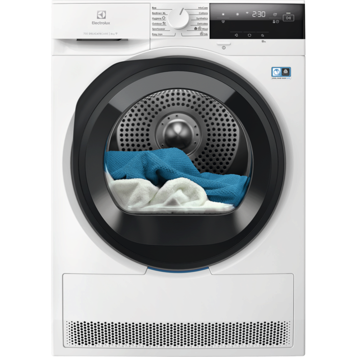 Kuivati Electrolux EW7D385UCE soojuspumbaga tehnoloogiagakuivati reguleerib trumli temperatuuri ja liikumist vastavalt konkreetsetele kangastele, tagades kohandatud puhastamise. Siidesemed säilitavad oma kuju, villased riided kuivavad ohutult ilma kokkutõmbumiseta ja taastatakse välisrõivaste vetthülgavus. Woolmarki sertifikaat.