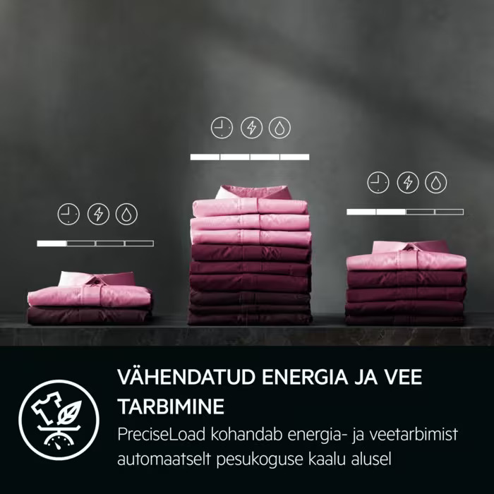 - PreciseLoad+ kaaluandurid annavad kohest ja täpset tagasisidet selle kohta, kas trumlid on ala- või ülekoormatud, aidates teil pesukogust ja pesuaine kasutamist optimeerida