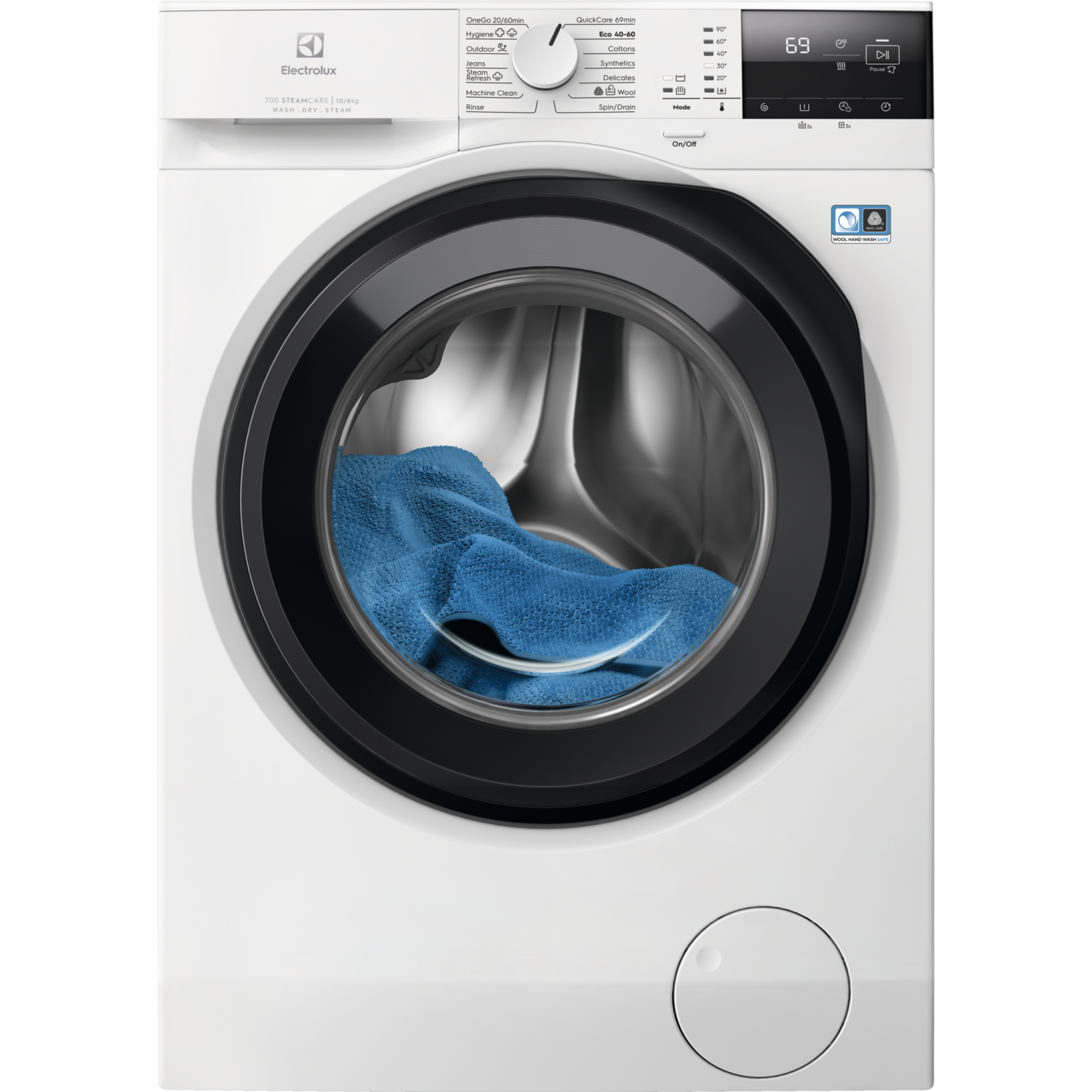 Programmi OneGo 20/60min abil saate väiksemaid segapesu koguseid pesta ja kuivatada vaid ühe tunniga või pesta vaid 20 minutiga. Nautige kiiret ja mugavat riiete hooldust, kui teil on kiire.