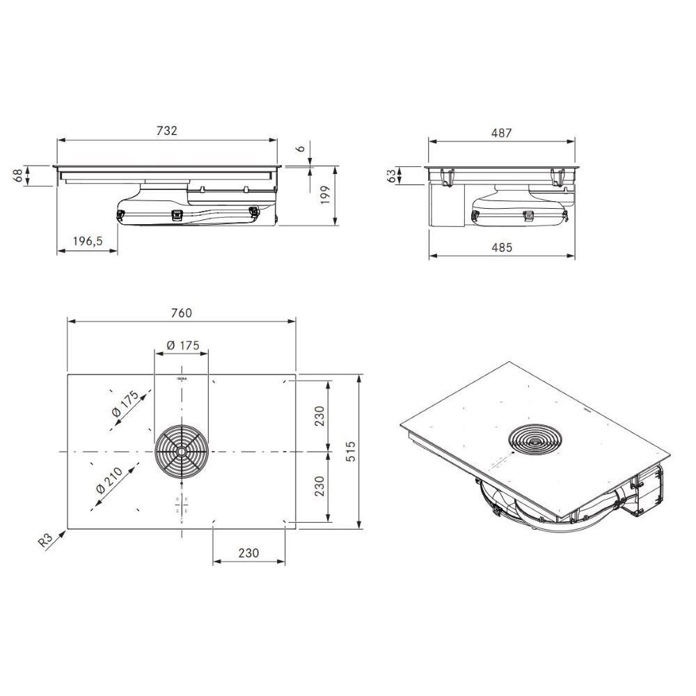 - Parem tagumine keeduala: 230 x 230 mm – 2,1 / 3 kW