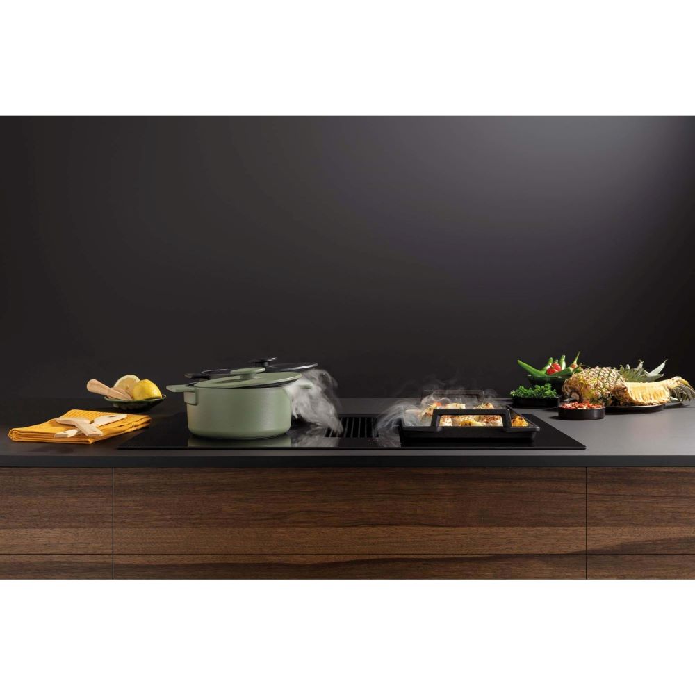 Võimsad keedualad on iga amatöörkoka unistus. Juhtnuppude abil saate need hõlpsasti sisse lülitada või ühendada need kokku, et saada eriti suur küpsetuspind. Kirsiks tordil on sellel sisseehitatud õhupuhastiga pliidiplaadil palju intuitiivseid funktsioone, nagu automaatne potituvastus.