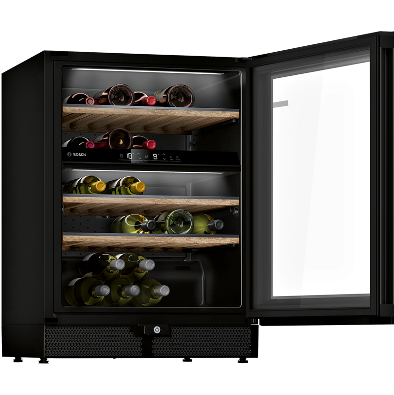 Veinikülmik Bosch KWK16ABGB on teie isiklik veinikelder – 81.8 cm kõrge ja 60 cm lai veinikülmik 2 täpse temperatuuritsooni ja vahemikus 5-20 °C reguleeritava temperatuuriga.